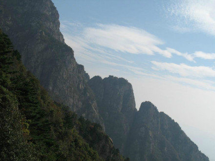 聽(tīng)松石:位于圣卦峰西北200米處,巖石凌空欲飛,下臨千米深谷。右叢中古松排列,綠旗招展,松濤聲聲,如萬(wàn)馬奔騰。