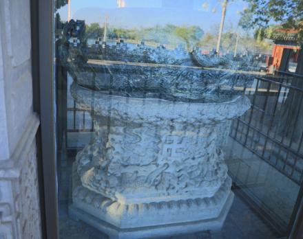 玉甕又稱“瀆山大玉!保谱饔谥猎辏1265年)?诔蕶E圓形,通高70公分,周長493公分,重約3500公斤,周身浮雕海龍、海馬、海豬、海犀等出沒于波濤之中,栩栩如生。元世祖忽必烈曾將玉甕放置瓊?cè)A島廣寒殿中,傳說曾用以盛酒大宴群臣。明代廣寒殿倒塌,玉甕失落民間。清乾隆十年(1745年)發(fā)現(xiàn)后,乾隆皇帝“令以千金易之,置承光殿中”,乾隆十四年(1749年)建玉甕亭,將玉甕陳設(shè)于亭中配以漢白玉雕花石座,命翰林四十人,各賦詩一首,刻于亭柱之上。