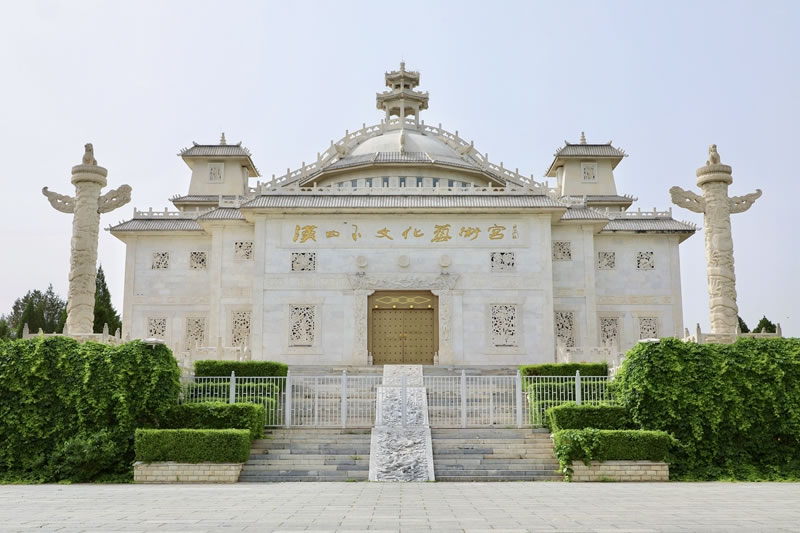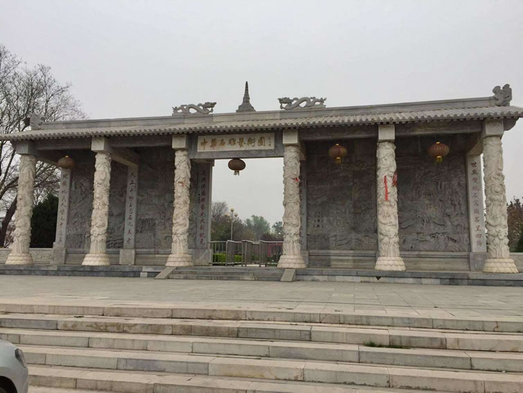 大石窩中華石雕藝術(shù)園位于北京市房山區(qū)大石窩鎮(zhèn)。園區(qū)面積2400畝,園區(qū)內(nèi)以石為主。石神、石鼎、石橋、十二生肖各種雕塑均以大理石為原材料,精雕細(xì)作而成,充分突出了石雕的藝術(shù)特色,是北京地區(qū)最大的石雕主題公園。漢白玉藝術(shù)宮位于中華石雕藝術(shù)園內(nèi),于2002年2月份動(dòng)土施工,建筑面積2200平方米。工程的用料全部采用質(zhì)地精良的漢白玉石材,共使用漢白玉石料740多立方米。藝術(shù)宮高27米,最高端是一座棲賢亭,下面是一個(gè)半球型的漢白玉天棚,天棚的東、南、西、北、東南、西南、東北、西北方向各有一條漢白玉脊龍,天棚下端是由36根漢白玉側(cè)柱組成的圓柱型建筑,宮門的正上方是長方形的漢白玉牌匾題有雕塑書法大師錢紹武提寫的“漢白玉石雕藝術(shù)宮”。藝術(shù)宮四周的漢白玉角柱、立板共280塊,其中鑲有各種圖案的漢白玉浮雕,在藝術(shù)宮的東西兩側(cè)還開有高4.4米的九龍漢白玉卷拱門。每道門正下方均有一塊好似保和殿前“云龍階石”的御路。
