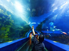 從南中國(guó)海下潛,經(jīng)過(guò)西太平洋、印度洋、紅海、地中海、到大西洋,海底隧道色彩斑斕的水中視覺(jué)效果,超大弧形亞克力膠展示窗掀開(kāi)大海神秘的面紗。37個(gè)展缸向游客展示了地球上最具代表性海域的觀賞魚(yú)類(lèi)。