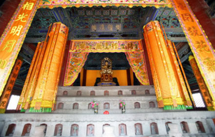 戒壇大殿:位于戒壇院內。始建于遼咸雍五年(1069),金元明清各代均有維修,現(xiàn)仍保持著遼代的建筑風格。大殿頂部四面呈坡形,正中間是一個正方形的小平臺。臺上安放有明成化十三年(1477)由僧人德秀捐贈的銅質鎏金寶頂,呈金剛寶座塔形分布。中間一個高約5米,四周四個較小。殿頂的上下檐之間有風廊環(huán)繞,兩層檐角均掛有風鈴,上圓下方。大殿外側四周有20根檐柱支撐,四面正中部分均配置有稱作“戒壇枋”的外枋門。正面門額上掛有“選佛場”匾額。殿內的橫枋上掛有清乾隆帝手書“樹精進幢”的匾額。橫枋內側掛有清康熙帝手書“清戒”二字的匾額。殿內天花板金漆彩畫.正中部分為“斗八藻井”,井內級深分為上下兩層。方形的井口內壁上四周雕有許多小天閣,閣內雕有小佛龕,龕內圓形小門洞內均有木雕漆金小佛像。藻井上層的圓形部分正中的穹頂上倒掛著一條木雕團龍,龍頭居于藻井中心,俯視下方。團龍四周的穹壁上還雕有八條“升龍”,合為“九龍護頂”。