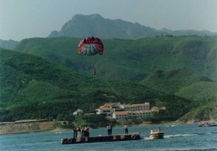 由泰國引進(jìn),跳傘平臺(tái)設(shè)在湖中,長40米,寬25米,總面積1000平方米。平臺(tái)浮在湖面上,由鐵錨固定在湖心。傘衣有兩種,可以根據(jù)游人的體重大小分別選用。游人在跳傘之前,平臺(tái)上穿好救生員和傘衣,傘衣由兩條高強(qiáng)度尼龍繩與傘和快艇相連,在快艇的高速牽引下,傘張開把人帶至空中,最高可達(dá)50米。隨著快艇的方向和速度,傘在空中時(shí)高時(shí)低,迂回曲折,在藍(lán)天碧水之間翱翔,湖區(qū)景色盡收眼底.