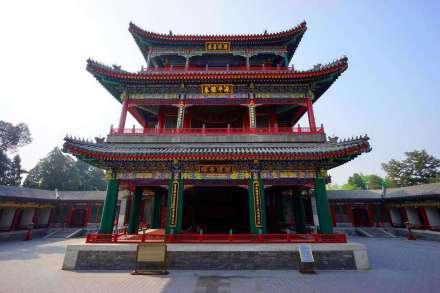大戲樓在德和園內(nèi),與承德避暑山莊里的清音閣、紫禁城內(nèi)的暢音閣,合稱清代三大戲臺。德和園大戲樓是為慈禧60歲生日修建,專供慈禧看戲。高21米,在頤和園中僅次于最高的佛香閣。戲樓共三層,后臺化妝樓二層。頂板上有七個“天井”,地板中有“地井”。舞臺底部有水井和五個方池。演神鬼戲時,可從“天”而降,也可從“地”而出,還可引水上臺。