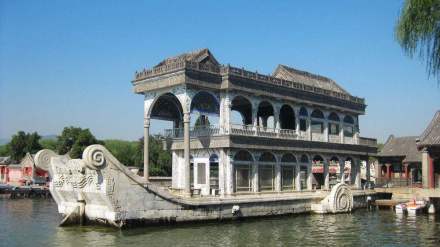 清晏舫俗稱石舫,在長廊西端湖邊,是一條大石船,寓“海清河晏”之意,是頤和園唯一帶有西洋風(fēng)格的建筑。它的前身是明朝圓靜寺的放生臺。乾隆修清漪園時,改臺為船,更名為“石舫”。石舫長36米,船用大理石雕刻堆砌而成。 船身上建有兩層船樓,船底花磚鋪地,窗戶為彩色玻璃,頂部磚雕裝飾。下雨時,落在船頂?shù)挠晁ㄟ^四角的空心柱子,由船身的四個龍頭口排入湖中。