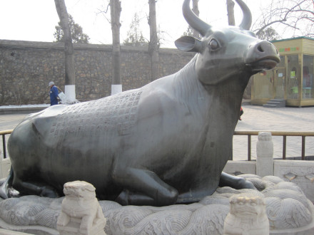 銅牛在昆明湖東岸,十七孔橋東橋頭北側(cè),為鎮(zhèn)壓水患而設(shè)。乾隆二十年1755年用銅鑄造,稱為“金牛”。