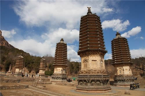 銀山塔林位于銀山南麓,現(xiàn)存17座墓塔,大小高矮不等,高者20余米,直徑達(dá)7米左右,矮者只有兩三米高。從塔的形制上看,大體上可分為兩大類:一為密檐式塔,二是覆缽式塔。這里保存的幾座大型墓塔全部是密檐式結(jié)構(gòu),是北京地區(qū)保存最好、最為集中的密檐式塔群。有六角形和八角形兩種,都是仿木結(jié)構(gòu)的密檐式磚塔。塔身自下而上逐層遞減,塔的高度不等,最高的佛覺禪師塔高22.8米。造型最為精美的是懿行大師塔,是典型的金代作品。塔高18米,平面為八角形,塔基由須彌座和斗拱勾欄平座組成,須彌座雕有獅頭寶瓶等紋飾,整個(gè)塔基除斗拱外,滿布花紋,雕刻繁縟,頗具匠心。仰蓮之上為塔身,塔身八隅旋圓柱,頂端砌以闌額普相枋,檐下每間補(bǔ)間旋施斗拱一朵,單抄四輔作。塔身四面辟假門,其余四面辟方形假窗。塔共拔檐13層,每層用疊澀手法向外砌出五層,代替檐椽,逐層收減,呈現(xiàn)出豐滿有力的卷殺。
