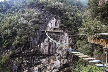 青龍橋位于景區(qū)接待中心服務(wù)區(qū)內(nèi),通過檢票口步行5分鐘可以到達(dá),是景區(qū)戶外項(xiàng)目,由長(zhǎng)80米、寬0.8米的鋼絲木板橋和長(zhǎng)30米、寬1.5米的玻璃棧道組成,高200米,站在青龍橋可俯視整個(gè)峽谷,可體驗(yàn)走鋼絲的感覺,驚險(xiǎn)刺激。