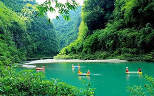 青龍谷位于彭水縣城西南18千米阿依河畔,峽谷高300米,長(zhǎng)1600米,蜿蜒幽曲如巨大的青龍。谷口塑有兩條青龍,叫作“雙龍迎客”,一是巖壁浮雕,龍身擺舞,龍爪張揚(yáng);一是盤龍騰空座雕。谷岸兩山逶迤交織,谷澗溪河蜿蜒穿洞,是典型的峽江峽谷風(fēng)光。谷內(nèi)兩岸翠竹連綿,綠樹成蔭。峽谷內(nèi)有一線天、黑洞等景觀。