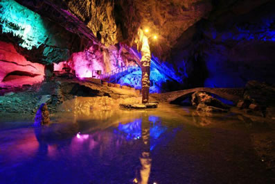 青龍洞位于牛角寨下行3.3千米處,溶洞環(huán)線總長(zhǎng)1590米,有上下兩個(gè)支洞,洞內(nèi)溫度宜人,常年恒溫16攝氏度。青龍洞是石灰?guī)r地區(qū)被地下水幾十萬年長(zhǎng)期溶蝕而形成,洞內(nèi)沉積物極其豐富,鐘乳石、石花、石筍、石幔、石旗、邊石壩等分布密集。沿途有漢白玉觀音像、九子龍門、龍池、龍女彩帳、龍王戲水、擎天玉柱、步步生蓮等景點(diǎn)與玻璃棧道、激光燈光融合的特色夢(mèng)幻溶洞景觀。在溶洞盡頭有一幕兩百多米高的銀白瀑布,名洞天飛瀑,瀑布四壁呈圓錐形,指向高高的穹頂,聲如雷鳴,雄偉壯觀。