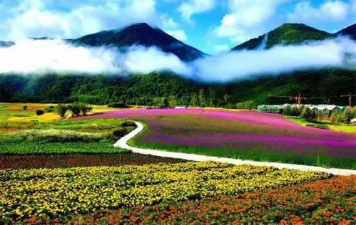 云中花海景區(qū)由1500畝構(gòu)圖花卉區(qū)、3000畝綴花草坪區(qū)、3000畝疏林草地鮮花區(qū)、2500畝有機生態(tài)農(nóng)業(yè)花海觀光區(qū)和休閑生活娛樂區(qū)構(gòu)成,是世界上高海拔地區(qū)最大、最美的花海景觀,面積是日本北海道花海的7倍。