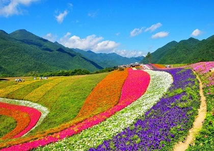 花簇錦丘:山嶺連綿,丘地起伏,地形此起彼伏,高低錯落,綢緞般的花朵點綴其中,若即若離,好似流動的樂章表達著花朵的優(yōu)雅與芬芳;ㄏ闼囊,花團錦簇,繽紛的色彩讓人目不暇接,野趣的美景讓人魂牽夢縈。