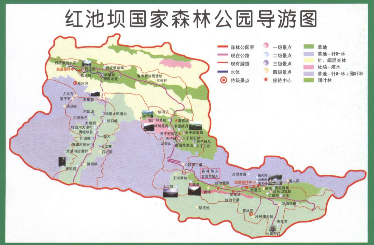 紅池壩草場由紅池壩、天子山、西流溪三大塊草場組成,面積達30余萬畝,是全國首屈一指的高山草場。盛夏,紅池壩茫茫草原、姹紫嫣紅、翠綠 夏冰洞欲滴,最高溫度僅為10余攝氏度,是難得的避暑勝地;秋天,天高氣爽、蜂飛蝶舞,在此可縱馬馳騁;冬天一派銀裝素裹,北國風光,是滑冰、滑雪的理想地方。在距草場不遠處還有聞名中外的世界奇觀——夏冰洞,每逢盛夏,洞中滴水成冰,滿目冰川、姿態(tài)萬千,而待數(shù)九隆冬,洞內(nèi)卻冰融水暖、細流涓涓,勝似溫泉,至今仍是一個謎。這里還是四條河流的發(fā)源地,“四異之水源于此”,巫溪縣原主管旅游的副縣長、現(xiàn)縣人大主任傅主任如是向記者介紹道,南到云陽的湯溪河、大寧河的源頭——西溪河、大寧河主要支流——后溪河、仁河這四條流向不同的河流均發(fā)源于此。
