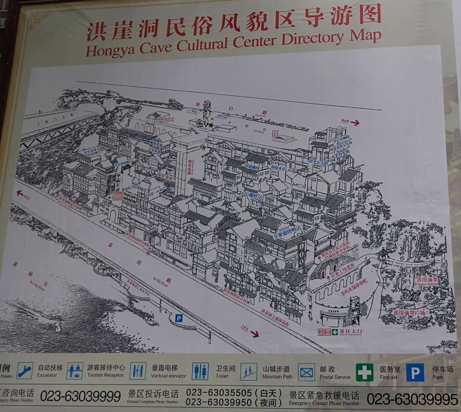 洪崖洞民俗風(fēng)貌區(qū)長約50米,總占地面積3.15萬平方米,分為紙鹽河精品古玩街、天成巷百業(yè)工坊老街、洪崖洞巴渝民俗美食街、洪崖洞異域美食街。有特色餐飲、休閑娛樂、巴渝民間工藝品、特色旅游商品及精品古玩等店鋪。洪崖洞一共有11層,夜晚燈光從晚上6點(diǎn)開燈,10點(diǎn)熄燈?赏跄_群樓觀洪崖滴翠,逛山城老街賞巴渝文化,燙山城火鍋看兩江匯流,品天下美食。形成了“一態(tài)、三絕、四街、八景”的經(jīng)營形態(tài),體現(xiàn)了巴渝文化休閑業(yè)態(tài)!耙粦B(tài)”指的是文化休閑業(yè)態(tài)!叭^”指的是吊腳樓、集鎮(zhèn)老街、巴文化;“四街”指洪崖洞的四條街:動感酒吧街、巴渝風(fēng)情街、盛宴街美食街、城市陽臺異域風(fēng)情街。四條大街分別融匯了時(shí)尚元素,主題迥異特色鮮明。成為重慶娛樂生活、夜生活的標(biāo)向!鞍司啊敝傅氖呛檠碌未、兩江匯流、吊腳樓群、洪崖群雕、城市陽臺、巴文化柱、濱江好吃街、嘉陵夕照。