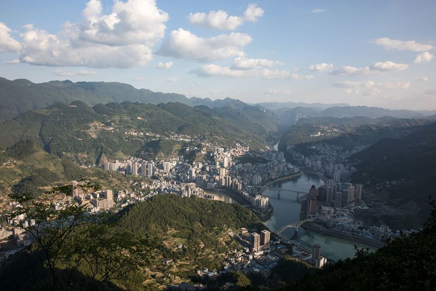 彭水縣,位于鄂黔隆起帶,向四川中臺坳下滑的斜坡上,形成西北高東南低的地勢特征。海拔190~1860米,相對高差1670米。地處武陵山區(qū),地勢西北高而東南低。地形分為構(gòu)造剝蝕的中、低山地形。地貌類型復(fù)雜,自然環(huán)境各異,“兩山夾一槽”是彭水地貌的主要特征。各類地貌中丘陵河谷區(qū)占13.39%,低山區(qū)占52.83%,中山區(qū)占34.03%。