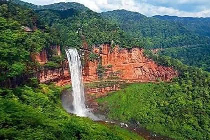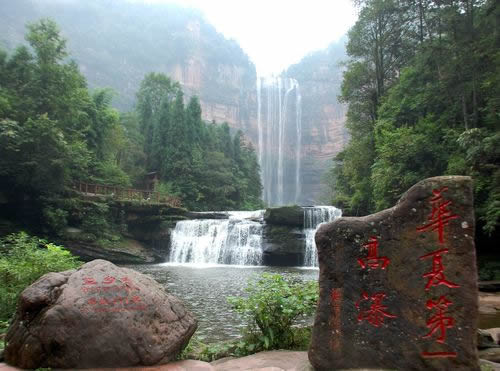 一雄一雌,一南一西,對巖相望,故名鴛鴦瀑布。南瀑高110.82米,為雄瀑,瀑水時而懸垂跌落,時而貼臂滑流;西瀑高90.25米,是雌瀑,瀑水絲絲縷縷,猶如戀人的情絲。雙瀑相望,一路飛珠涌向?qū)Ψ剑詈笤诠鹊兹跒橐惑w,向北而去。