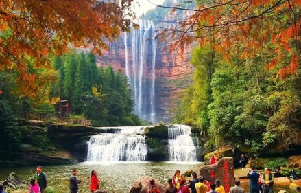 三道拐瀑布是四面山最美的瀑布之一,瀑布不高,但造型奇特,三次跌落三次成瀑,是四面山少見的三級瀑布。瀑布處白水丹巖,古樹藤蘿,綠樹紅花,黑石溪流,在瀑布下仿若人在畫中游。