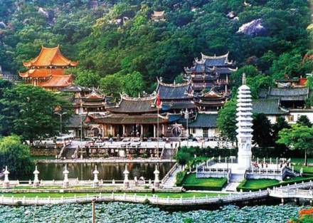 南普陀寺,位于廈門市思明區(qū),始建于唐末五代,初稱泗洲院。北宋僧文翠改建稱無盡巖。元廢。明初復建,更名普照寺。明末詩僧覺光和尚遷建于山前,殿堂院舍齊備,住僧常達百余眾,清初又廢于兵禍。清康熙二十二年(1684年),靖海候施瑯收復臺灣后駐鎮(zhèn)廈門,捐資修復寺院舊觀,又增建大悲閣奉觀音菩薩,并以之與浙江普陀山觀音道場相類比,更名為南普陀寺,此后數(shù)百年來,經歷代主持景峰、省己、喜參諸和尚多次重修擴建,至民國初年,已構成三殿七堂俱全的禪寺格局。
