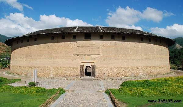 二宜樓:這座被譽為"國之瑰寶"的圓土樓,座落在華安縣仙都鎮(zhèn)大地村。仙都、大地,這是多么富有詩意的名字,其實二宜樓就是人間天堂的一座民居,就是中華大地的一顆璀璨明珠。 二宜樓依山傍水,樓后峰巒疊嶂,近處山丘綿延,猶如蜈蚣緩緩爬行(風(fēng)水先生稱之為"蜈蚣吐珠地");兩條清澈的小溪在樓前交匯后,直奔西南而去。青山綠水,與黃墻黑瓦交相輝映,小橋、樓閣、翠竹、村舍點綴其間,渾然一體,正是"宜山宜水"的一派旖旎風(fēng)光。樓內(nèi)祖廳便有一對柱楹,專門概述這一景觀:"倚杯石而為屏,四峰拱峙集邃閣;對龜山以作案,二水瀠洄萃高樓。" 所謂宜山宜水,其實還隱寓樓主蔣仕熊排行第二,又是第二次擇地,才選中這蜈蚣吐珠穴位,其得意之情溢于言表。在族人的傳說里,蔣仕熊年輕時是個種田能手,他身材高大,體格健壯,臂力超人,能使一把廿四斤重的大刀,可惜他人才超群,卻遲遲未能成家,說是犯了"孤鸞命",注定一輩子打光棍。族人背地里取笑他說:"無某(妻)無猴,鎖匙掛褲頭。"他一氣之下出走他鄉(xiāng),到安溪、漳平等地開墾荒田幾百畝。不久,他遇到了一個魏氏姑娘,兩人婚配后,生了六個兒子。蔣仕熊晚年衣錦返鄉(xiāng),開始投巨資建樓,由于操勞過度,他在二宜樓尚未建成時便不幸逝世,他的六個兒子、十七個孫子繼承遺志,艱苦努力,終于在清乾隆35年(1770年)把大樓建成。