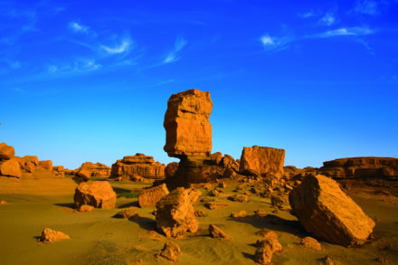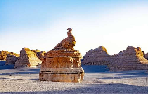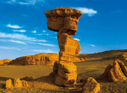 柱狀雅丹,是形態(tài)最為獨特的柱狀雅丹體。上部的粘土層難風化,而下部的沙質(zhì)層卻易于風化。這種差異形成了頂部粗大的塊體高懸于下部細小的柱體之上,在形態(tài)上似天外來客眺望凝思,吸引著游人去探索它的奧秘。