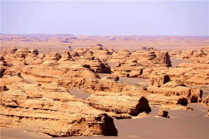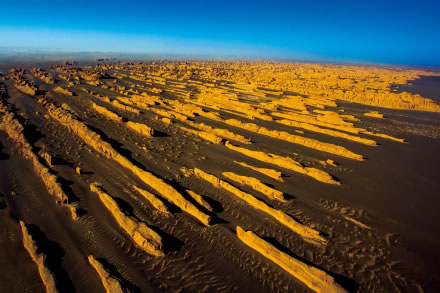 壟崗狀雅丹,分布在景區(qū)的西北部,南北斷續(xù)延伸可達上千米,寬5-30m。遠遠望去,規(guī)模宏大的雅丹猶如氣勢磅礴的遠航艦隊,在浩瀚無垠的漠海上劈波斬浪,蔚為壯觀。這種大規(guī)模集中連片的壟崗狀雅丹群在國內(nèi)外罕見。