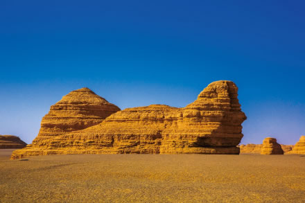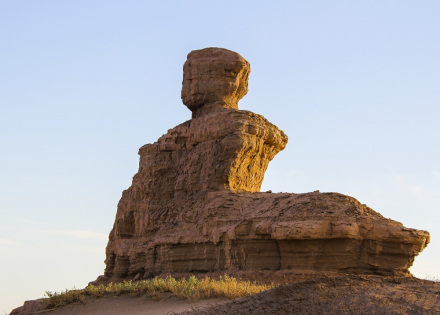 墻狀雅丹,屬于墻狀雅丹體向塔狀雅丹體的過渡類型。雅丹體由沙質(zhì)和泥質(zhì)沉積物組成,差異侵蝕風化作用形成了凹凸不平的表面。遠遠望去,酷似埃及的“獅身人面像”,充分展示了大自然的巧奪天工。
