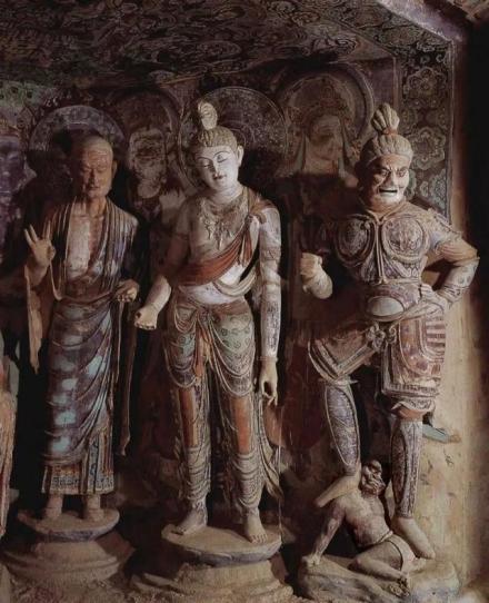 (1)早期——發(fā)展期,包括十六國、北魏、西魏、北周四個時代,歷時一百八十年。早期洞窟形制有三:1.禪窟,塑像在正龕。2.方形或長方形殿堂窟,塑像置于正龕或南北壁列龕內(nèi)。3.中心柱窟,塑像置于長方形柱四面之龕內(nèi)。從佛像類別上分,有彌勒像、釋迦像和釋迦多寶并坐像,以表現(xiàn)的事態(tài)分,有說法像、禪定像、思惟像。中心柱四面多為苦修、禪定、降魔、成道等像,主尊兩側(cè)多有侍從菩薩,形成一佛二菩薩的格式。早期彩塑多以彌勒為主尊,這與當(dāng)時傳自西域的彌勒信仰有密切關(guān)系。