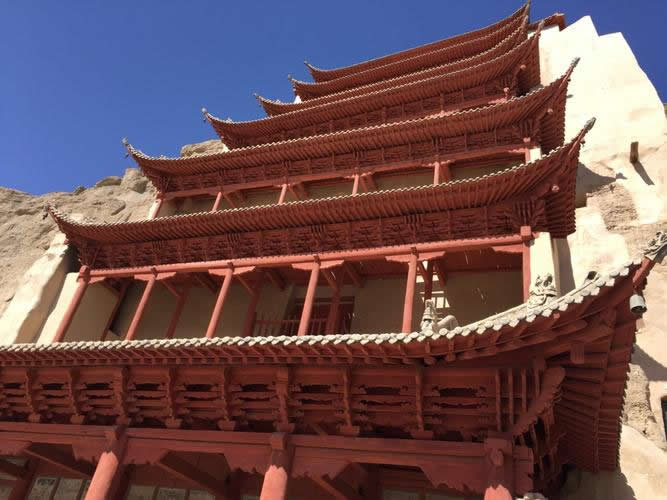 閣樓依崖就窟而起,下八層為五間六柱大型兩角窟檐,檐角上翹,有線脊,下垂風(fēng)鐸(俗稱鐵馬)。第一層正對本窟巨型窟門,第四層和第七層各對洞窟明窗。第九層為八角頂,上豎3米高寶瓶,窟、像即以此頂相覆,三者共融一體。據(jù)P.2762《張淮深勛德記》及《宋乾德四年重修北大像記》、1936年《重修千佛洞九層樓碑記》(此碑已毀,僅存錄文)記載,武周初建大佛時,樓為四層。晚唐乾符年間(874—879),沙州歸義軍節(jié)度使張淮深重建,改四層為五層。宋乾德四年(966)沙州歸義軍節(jié)度使、托西大王曹元忠及其妻涼國夫人潯陽翟氏避暑莫高窟,將下兩層糟朽梁、柱拆換重建(上三層仍保存原建筑)。清光緒三十四年(1908),敦煌商民戴奉鈺集資重修,改五層為七層。1928年,劉驥德等合莫高窟住持喇嘛易昌恕等重建,改七層為九層,于1935年建成,即今之“九層樓”。