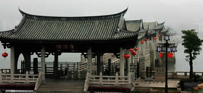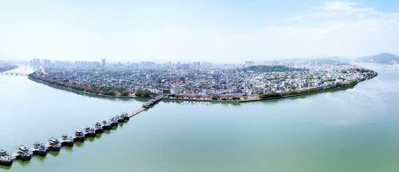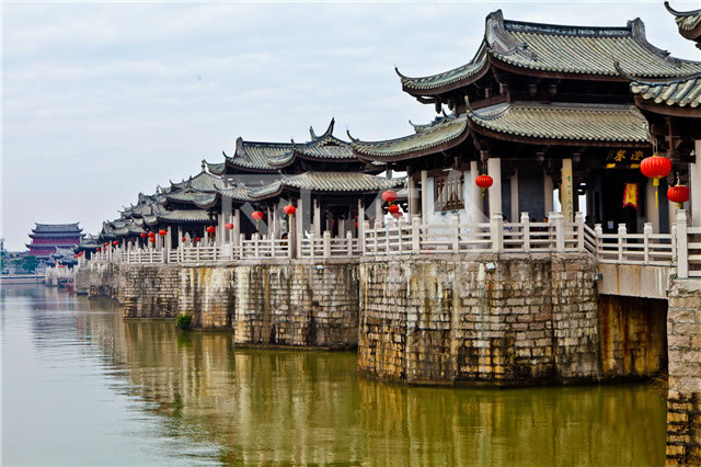 廣濟(jì)橋始建于南宋乾道七年(1171年);明朝嘉靖九年(公元1530年)形成“十八梭船廿四洲”的格局;解放前殘破不堪;1958年進(jìn)行加固維修,并拆除了十八梭船,改建為三孔鋼架及兩處高樁承臺(tái)式橋梁;2003年10月開(kāi)始進(jìn)行全面維修,總體按明代風(fēng)格為修復(fù)依據(jù),功能定位為旅游觀光步行橋;2007年竣工。