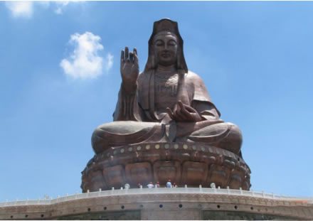 云海蓮臺地處西樵山風景名勝區(qū)中心地帶,是以觀音文化為主題的大型景區(qū)。主要建筑有觀音法相、牌坊、影壁、放生池和浮雕等。觀音法相高達61.9米,是世界上最高的觀音造像。游客從北向入口,迎面聳立著一座六柱五門天柱牌坊,牌坊后隔著一個廣場,建有影壁,用優(yōu)質花崗巖雕筑,左右各設山門,壁后刻有觀音六字真言,漢文由九華山住持、安徽省佛教協(xié)會會長仁德手書,藏文由西藏活佛親筆題寫。影壁上還刻有韋陀法像。影壁后為一放生池,池旁圍以蓮花作雕的白石欄桿,跨過放生池上的石拱橋,沿著283級開闊而整齊的石臺階,便可達觀音法像的蓮花座下。