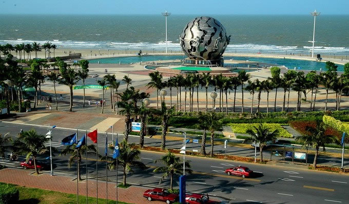 海灘公園,是銀灘國家旅游假區(qū)的重要組成部分,位于北海市中心以南十公里的北海銀灘中部。公園由三部份組成,東區(qū)設有琴、棋、書、畫院.中間是海灘、海上活動區(qū);西區(qū)是海洋生物館、兒童戲水池、大型露天舞池等組成的游樂區(qū),可同時容納游客6萬多人。 [21]鋼塑“潮”位于銀灘旅游度假區(qū)的海灘公園內(nèi),它是由地道的北海人、中央美術學院副教授魏小明設計,由中房北海公司投資一千多萬元,用兩個月零15天建成。整座雕塑以象征一顆大明珠的球體和七位裸體少女護衛(wèi)球為主體,并由安裝有5200個噴頭的音樂噴泉組成。雕塑高23米,鋼球直徑20米。巨大的鋼球是用不銹鋼鏤空制成。整座建筑以大海、珍珠、潮水為背影。