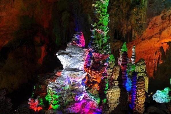 鴛鴦洞,位于縣城東面,鳳凰山腰,海拔700余米,為云貴高原南緣巖溶中高位雙層溶洞,洞中石柱、石筍、石幔琳瑯滿目。洞口高7.5m,寬12m。洞長(zhǎng)480米,最寬處320米,巖廳最高點(diǎn)52米,面積為2.5萬(wàn)平方米,洞內(nèi)大廳規(guī)模宏大。從洞口進(jìn)入便是第一層洞,游程迂回全長(zhǎng)1200米,洞中乳石崢嶸,石筍高達(dá)36.4m,象擎天巨柱直插天空,20m以上高度的石筍約15個(gè),6m左右高度的石筍更是不計(jì)其數(shù),在多處聚集形成了奇特的洞中石林景觀。洞內(nèi)最大的石幔高約15m,寬6m,顏色潔白,酷似瀑布。
