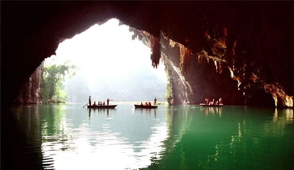 百鳥(niǎo)巖位于甲篆鄉(xiāng)烈屯西北面的漠齋山下,別名龍虎洞。因洞內(nèi)燕子棲集,蝙蝠掠飛,又名百鳥(niǎo)洞。盤(pán)陽(yáng)河自吉屯白熊洞潛入山下,形成1000多米的伏流暗河后,在此洞流出。洞口寬50米,一石壁把洞口分成兩個(gè)略呈三角形的左右洞口。左側(cè)洞口寬40米,高15米,兩洞口內(nèi)側(cè)相通。洞深500米,蜿蜒曲折,直通與白熊洞一山之隔的拉類?ài)晗碌囊粋(gè)側(cè)洞口。洞中水平如鏡,深不可測(cè),寬處約40米,窄處10米,從洞口行舟至300米轉(zhuǎn)折處,距水面30米處有一圓形天窗,山坳之光照到水面,猶如舞臺(tái)上的光束,色彩紛呈,近右側(cè)洞口處有沙灘,可停靠舟船。沙灘右側(cè)是一塊30多平方米的石臺(tái),臺(tái)面深溝淺窩,坑坑坎坎,石臺(tái)一側(cè),洞壁雪白,可攀援其中。有石鷹、石柱、石幔、石觀音菩薩等,百態(tài)千姿,令人目不暇接。石臺(tái)的周圍有仙女梳妝、海螺石,石螺對(duì)面有石桌、石缸和石松果等。側(cè)面洞口外香椿林下野花艷目植被繁衍,把洞口點(diǎn)綴得幽靜雅致。洞中歧洞叉水道不可勝數(shù),密如蜂房,不知所向,整個(gè)洞仿佛一座裝飾華麗、景幻莫測(cè)的水下龍宮。其奇特的景象似桂林蘆笛巖,又因非乘舟不能游覽,游人贈(zèng)予“水上蘆笛巖”的美譽(yù)。