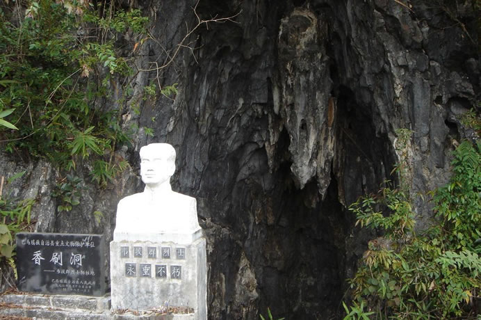香刷洞位于西山鄉(xiāng)弄列村東北部的一座半山坡上,香刷洞為石灰?guī)r溶洞,洞口高5米,深10米,寬約6米,洞底型似臥底,洞中一年四季比較干燥,洞內(nèi)可容納20多人。洞內(nèi)右側(cè)一高處有一平臺(tái),可以臥人,臺(tái)左側(cè)有一小洞穴可以匍伏出洞外。民國(guó)21年間(1932年)10月19日晚,堅(jiān)持在右江斗爭(zhēng)的中國(guó)工農(nóng)紅軍獨(dú)立第三師師長(zhǎng)韋拔群在戰(zhàn)略轉(zhuǎn)移中隱藏在此洞中,不幸被叛徒韋昂殺害,犧牲時(shí)僅38歲。香刷洞是巴馬瑤族自治縣縣級(jí)重點(diǎn)文物保護(hù)單位。