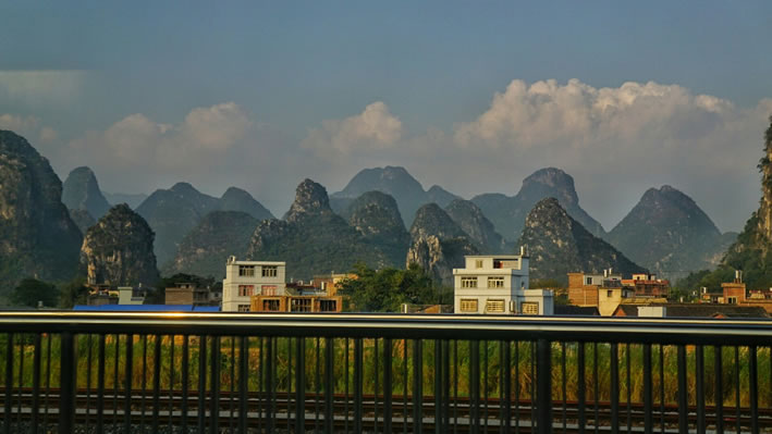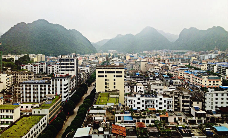 地形地貌 富川瑤族自治縣位于桂東北山區(qū),四面環(huán)山,中間低落,略呈橢圓形盆地,地勢北高南低。西部及東南部分布著橫亙連綿的山脈,谷深坡陡,地勢高峻;東部為石灰?guī)r溶蝕而成的巖溶峰林地貌,群峰拔挺;東北面為丘陵地貌,頂圓坡緩,波狀起伏;中部為寬坦的溶蝕平原地區(qū),地勢低陲,孤峰獨(dú)山拔地而起。