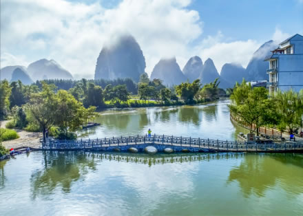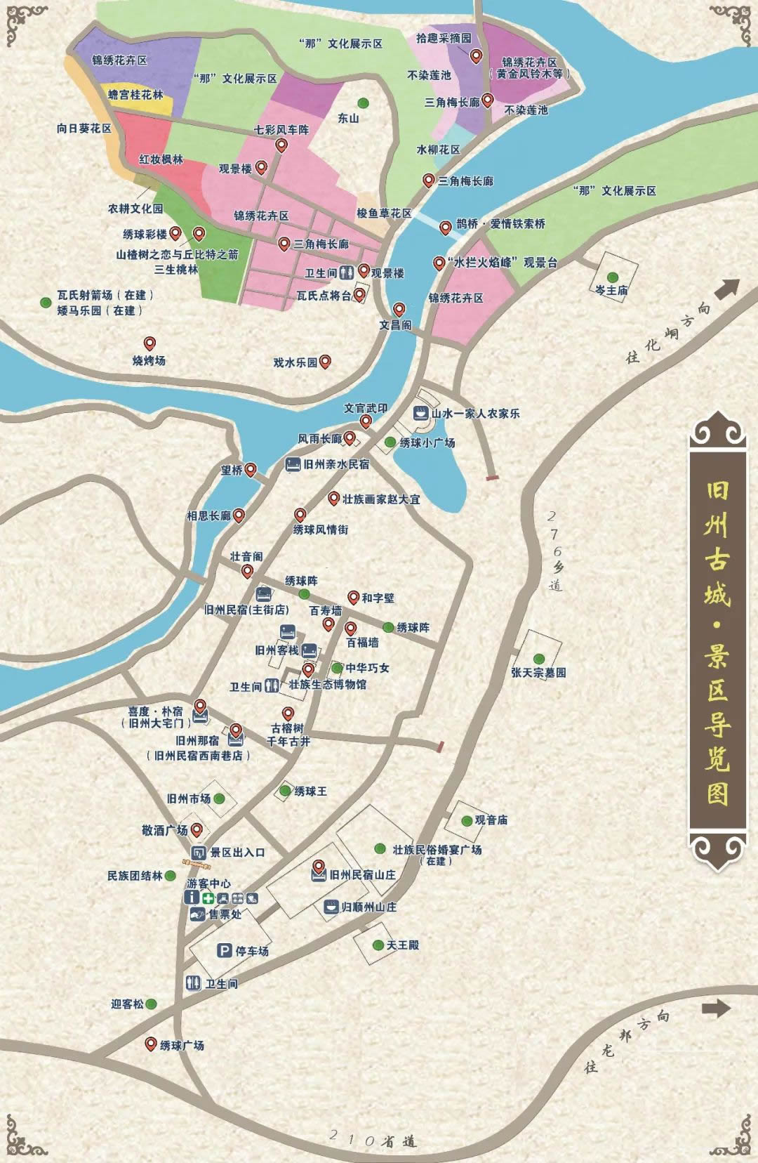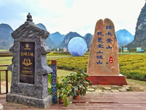 舊州景區(qū)位于廣西壯族自治區(qū)靖西市市區(qū)以南8公里,四面被喀斯特地貌群山層層環(huán)抱,古城在兩條河流的匯集處依水而建,年平均氣溫19.9℃,四季宜人!吧剿惞鹆,氣候似昆明”,人文古跡眾多,壯族風(fēng)情濃郁,素有“壯族活的博物館”之美譽(yù)。2018年成功評定為國家AAAA級景區(qū)。