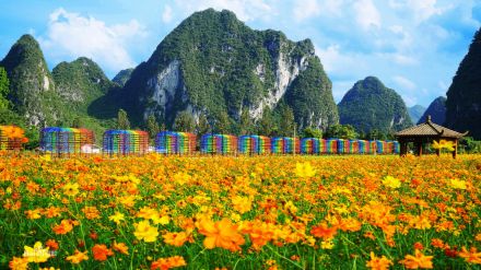 千畝錦繡花海舊州古城東山腳下,綿延千畝的種植區(qū)內(nèi)花卉、稻田、季節(jié)性花樹、觀賞性苗木錯(cuò)落有致,因其形似一副色彩斑斕的巨幅壯錦而得名。分布有錦繡花海區(qū)、三生桃林、山楂樹之戀、丘比特之箭、七彩風(fēng)車陣、蟾宮桂花林、紅妝楓林、不染蓮池“那”文化展示區(qū)(水稻種植區(qū)和拾趣采摘園)等花卉景觀。