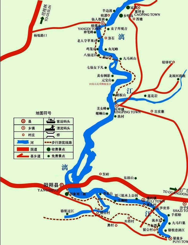 興坪鎮(zhèn)位于廣西壯族自治區(qū)桂林市陽朔縣縣城東北部,漓江上游兩岸,距縣城25公里。漓江流經(jīng)興坪,形成“S”字形河灣,是漓江風光的薈萃之地。葉劍英元帥《由桂林舟游陽朔》詩道:“春風漓水客舟輕,夾岸奇峰列送迎。馬躍華山人睇鏡,果然佳勝在光坪”。山水相依,景點密集,兼有奇、險、秀、美、趣的特點。