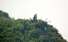 過下龍村迎西摩天嶺與沖天峰“天柱夾江”,沖天峰又與魚尾峰、老人坐雞峰合稱“下龍三峰”。下龍一帶,景色如畫,前有奇峰倒影,后顯層巒疊嶂,前美國總統(tǒng)尼克松游覽至此時,曾把右岸一峰比喻成金字塔。