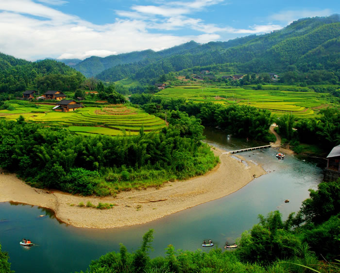 地形地貌 融安縣地形似腿狀,地勢(shì)東北高西南低。東北部的廣福頂山脈是與臨桂、永福、龍勝、三江等縣的自然分界線。境內(nèi)山脈中,最高的廣福頂海拔1457.8米,往東延伸的有三陽(yáng)頂、九峰山、香爐嶺、獅子嶺、黑石界、十二瓣山、波有嶺等,海拔均在1000米以上。往北延伸的有從白山、翁古頂、雨花山、貓頭頂?shù)龋0我嘣?000米以上。南部邊緣有九頭山、北寨大山、大將山等,海拔在400米以上。西部邊緣是元寶山脈延仲來(lái)的敲邦嶺、牛欄山、圣山嶺等,海拔在700米以上。