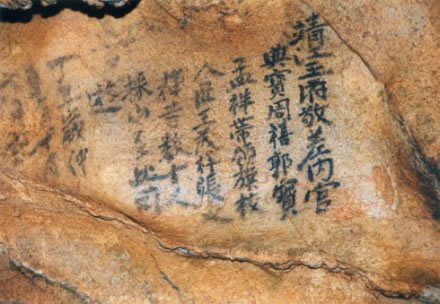 在蘆笛巖壁書中,保存比較完整、比較清晰是明代靖江王府采山隊的題名,是一件為人注重的文物。題筆寫道:“靖江王府敬差內(nèi)官典寶周禧、郭寶、孟祥帶領旗校人匠王茂祥、張文輝等數(shù)人十人采山至此,同游。丁丑歲仲夏月十有六日記!