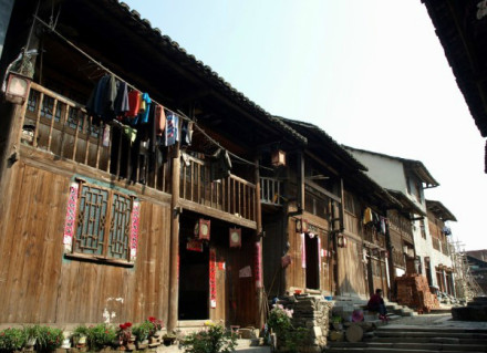 早期的民居建筑也大多還保留著漢文化的特點,以安徽、江西居多,其建筑形式、藝術(shù)手法均具明顯的徽派建筑特點。民居的基本單元一般為開間10米(三間開),進深8米左右的兩到三層木構(gòu)建筑。建筑結(jié)構(gòu)采用穿斗式人字形坡頂,蓋小青瓦,外圍磚墻或泥石墻,頂部做成迭落形,端部做成馬頭狀,俗稱“馬頭墻”。屋檐出水向外挑出30厘米,采用“雙重脊檐”形式,青色的披檐鑲嵌在灰白色磚墻上。宅基均高出地面1米,房屋之間相對排列整齊有序,每家每戶前均有清一色的幾階青石臺基排列,大門上掛有標志著屋主籍貫、身份的匾額,如“關(guān)西第”、“科甲第”、“洛陽第”等,且大門外墻呈“外八字”結(jié)構(gòu),其平面布置自外而內(nèi),先門第,再前屋,再正屋、后屋,每一屋均由天井相隔,天井以青石鋪就,低于臺基,天井內(nèi)放有青石制成的防火缸,缸上雕龍或飾有古代兵器戟,內(nèi)有暗溝以便排水,古鎮(zhèn)民居內(nèi)每戶必有一后門,且后門戶戶相通,目的是為了軍人家眷躲避戰(zhàn)火,戰(zhàn)事來臨時家家互相通告,由后門撤離至安全地帶。