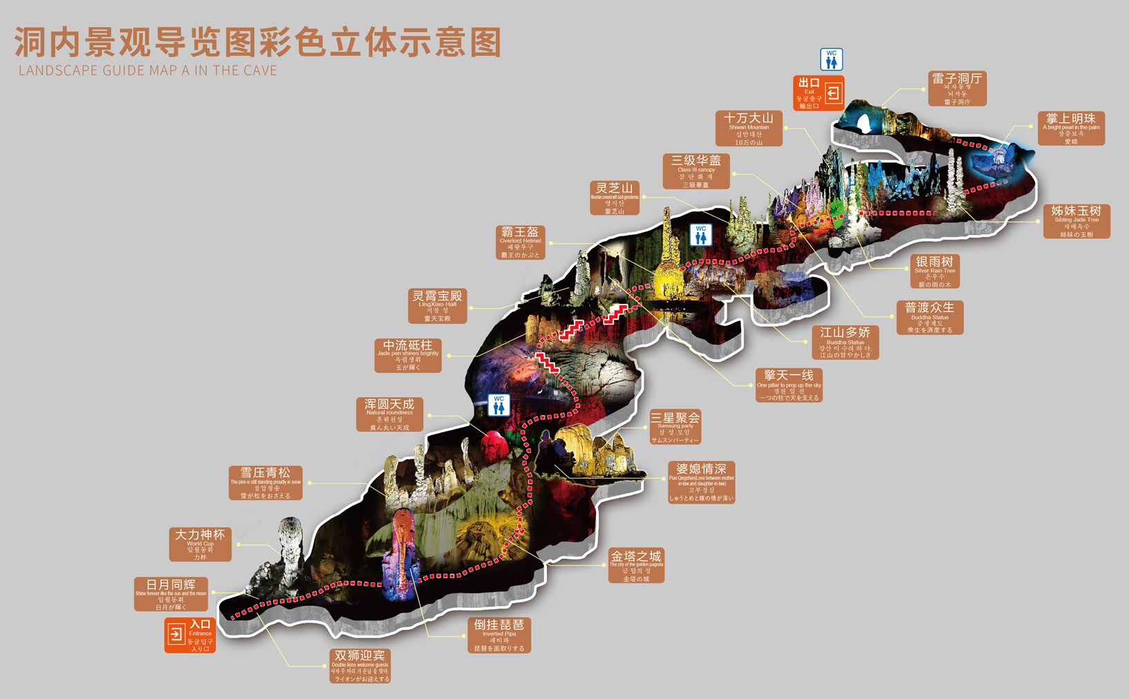 全長一點一公里,面積五萬多平方米。分為漫谷長廊、北海隴、宴會大廳、江南澤國四部分!奥乳L廊”,洞廊深長、壁間鐘乳石奇異多姿!把鐣髲d”,面積一萬多平方米,洞內(nèi)平坦干燥,是游覽途中理想的休息、進餐和活動場所!氨焙k]”,數(shù)條游龍似的邊石壩蜿蜒伸展,鐘乳石林立。中有一深潭,潭中有九根石筍,稱“清潭九筍”。“江南澤國”,流水、湖泊、水塘、水田交錯,流水潺潺,田水如鏡。