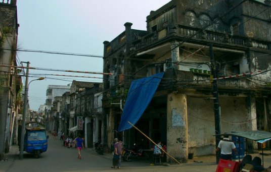 據(jù)史書記載,定安古城從籌建到1519年竣工共費(fèi)時(shí)13年。城圍長(zhǎng)近千米,高四米多,寬五米多,開有東、南、西城門,各建有城樓。北門是1545年才開的,后來(lái)因不堪倭寇的騷擾,曾經(jīng)堵上過(guò),直到1690年才又重開。古城的城墻在建國(guó)初期就已經(jīng)被拆毀了,城門這一塊大概是因?yàn)榭此Y(jié)實(shí)牢固,便利用來(lái)建了樓房,因此還被保存下來(lái)。城門洞里放著兩只卸了龍頭的龍舟,已經(jīng)很舊,架在木樁子上。地是用青石板鋪設(shè)的,經(jīng)過(guò)幾百年人來(lái)人往,石板被磨得很薄。門洞里的墻面上也是一塊塊青石磚砌的,摸上去很干爽,一點(diǎn)也沒有陳年的霉味。