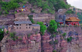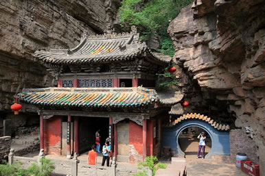 一絕“橋樓殿”。橋凌駕于百仞峭壁之間,仰視藍(lán)天一線,俯首萬(wàn)丈深淵。形制如同趙州橋敞肩拱式。橋上建樓,云飛樓動(dòng),樓內(nèi)建殿,殿內(nèi)三尊大佛。真是“千丈虹橋望入微,天光云彩共樓飛”,不是仙境勝似仙境,疑是天堂落塵!,F(xiàn)為中國(guó)三大懸空寺之一。