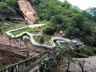 老龍?zhí)队升垖m瀑布鑿蝕而成,潭周邊人工雕筑的巨龍,表現手法抽象,像長在崖壁上的一條巖脈,騰云飛舞氣勢磅礴。