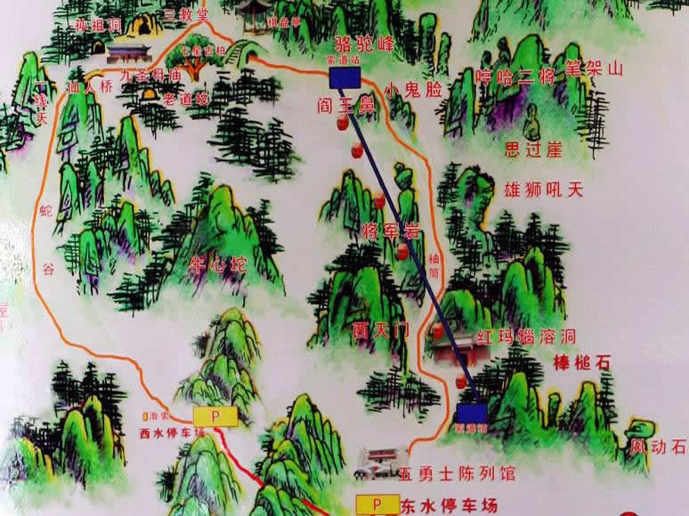 棋盤坨,為狼牙山的主要山峰之一,民國《易縣志稿》載:“棋盤坨在易縣西南95里,郎山(老君堂所在的褡褳峰)之西,高數(shù)里,四周高峰,一徑可入,上有石棋盤,又有三池,清泉不竭!臂绲撞坑形魉,其西南側(cè)的峨眉山、眾軍山,皆為古戰(zhàn)場。由西水寨攀登,可達(dá)西天門,徑路兩側(cè)山體如刀削斧劈,石筍如寶瓶。西天門附近,有紅瑪瑙巖溶洞,原名“天井”。過了西天門,多處奇峰、怪石、洞穴。如棒槌崖、黃羅傘、老虎洞、老虎嘴、飲虎池、相思谷、仙女泉、無底洞、鎮(zhèn)妖石,奇特的陰陽石,陽面似武將,陰面猶如仕女,當(dāng)?shù)厝朔Q“媳婦頭”。沿2900級登天梯石階,達(dá)棋盤坨,坨頂建狼牙山五壯士塔,塔西的小蓮花峰(小蓮花瓣),即五壯士跳崖處。坨西有胭脂湖。坨北有天險(xiǎn)閻王鼻子、小鬼臉。