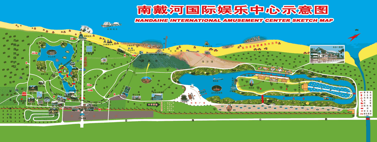 南戴河國際娛樂中心包含歡樂大世界、碧海金沙、金龍山、中華荷園、槐花湖五大區(qū)域。這里遠離污染,環(huán)境清幽,空氣清新,植被蔥郁,完全具備了當今國際海岸旅游的五大要素:海洋、沙灘、陽光、空氣、綠色。