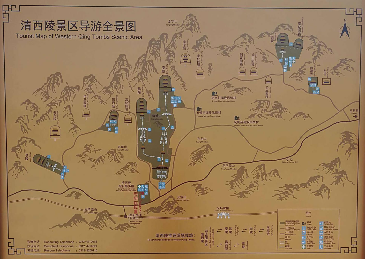 清西陵陵區(qū)內(nèi)各陵園共用祖山、石牌坊、大紅門,周圍均用風(fēng)水圍墻和火道、界樁圍繞。陵寢布局有主有從,皇后陵和妃園寢均以本朝帝陵為中心,分建左右,自成一區(qū),體現(xiàn)了附屬關(guān)系,表明陪葬之意。各帝陵神道均與主陵神道相接,后陵神道與本朝帝陵神道相接,形成枝狀的神道網(wǎng)絡(luò)。這些特點(diǎn)是清代以前的歷代皇陵所不具備的。整個(gè)清西陵陵區(qū)以清世宗雍正帝的泰陵為中心,西面分布著清仁宗昌陵和清宣宗慕陵,東面分布著清德宗崇陵、溥儀墓以及阿哥、公主園寢和永福寺等建筑。