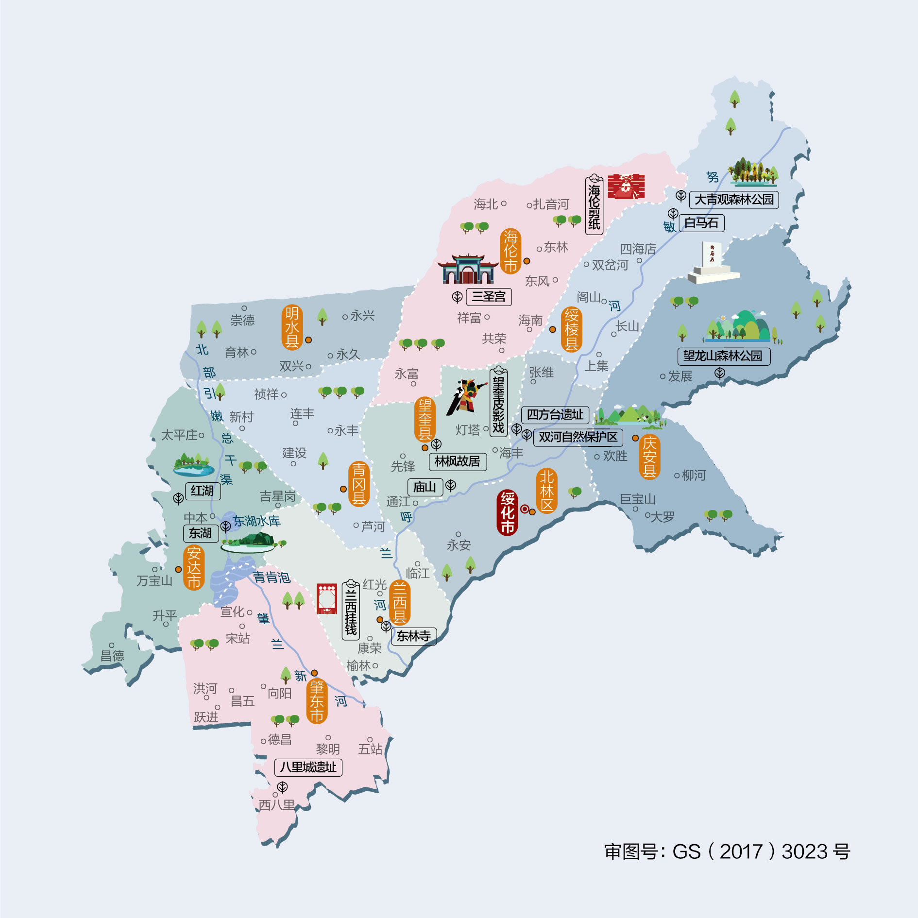 綏化市轄1個市轄區(qū)、6個縣、代管3個縣級市: