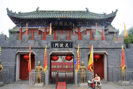 天波楊府是北宋抗遼名將楊業(yè)的府邸,位于宋朝首都東京(今開封市)城內(nèi)西北隅,天波門的金水河旁,故名“天波楊府”。因楊業(yè)忠心報(bào)國(guó),楊家將世代忠良,宋太宗趙光義愛其清正剛直,不善巧言諂媚的性格,敕在天波門的金水河邊建無(wú)佞府一座,賜金錢五百萬(wàn)蓋“清風(fēng)無(wú)佞天波滴水樓”,并親筆御書“天波楊府”匾額。為國(guó)家AAAA級(jí)景區(qū)。